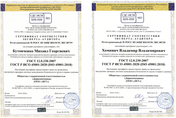 Одновременно ООО «ДКТ» 26.01.2026 г. получило СЕРТИФИКАТ СООТВЕТСТВИЯ № РОСС RU.04ЦСЖ0.ОС01.СМК.00681, который подтверждает факт соответствия на предприятии Системы менеджмента безопасности труда и охраны здоровья применительно к разработке, изготовлению и реализации коммунальных машин и оборудования требованиям ГОСТ 12.0.230-2007 и ГОСТ Р ИСО 45001-2020 (ISO 45001:2018). Свою квалификацию для проведения внутренних проверок на соответствие этим ГОСТам подтвердили эксперты-аудиторы Бутовченко М.Г. и Хоминич В.В.